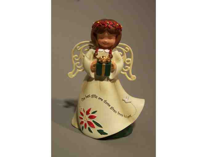 Pavilion Gift Company offers an Ella Bella Angel holding a present. She reminds us, ''The best gifts are those given from the heart!'' 6 inches tall. Bid high! Everyone loves little angels!
