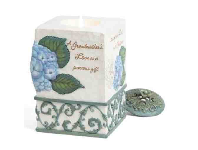 This attractive Comfort in Bloom tea light holder makes a lovely gift for the special grandmother in your life. The 3.5''x 3.5'' square holder, from Pavilion Gift Company, Bergen, NY, features a textured white-washed wood finish, embossed blue hydrangeas, a scroll design and a patina lid. The engraved sentiment comes right from the heart, A Grandmother's love is a precious gift, touching our lives with tenderness, filling our hearts with happiness, leaving us memorable moments to treasure. A tea light candle comes with the set.