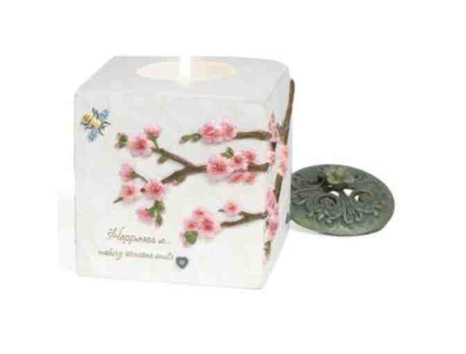 This attractive Comfort in Bloom tea light holder makes a lovely gift for a special person in your life. The 3.5''x3.5'' square holder, from Pavilion Gift Company, Bergen NY, features a textured white-washed wood finish, embossed with lovely pink cherry blossoms and a patina lid. The engraved message will bring joy to the heart, Happiness is enjoying the simple things in Life. Happiness is knowing you are loved. Happiness is sharing laughter with a Friend. Happiness is making someone smile. A tea light is included.