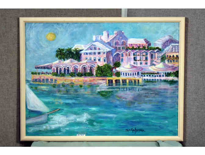 A lovely pastel palette is will take you on a journey to the lush resorts of the Caribbean when you bid high to win this original work of art from Artist Marylin Grossman. Framed and ready for hanging this acrylic on canvas work of art measures 26'' x 35''. Inspired by the colors and feel of the turn-of-the-century resorts that lined the beaches of the Caribbean.