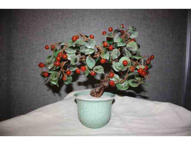 Exquisite vintage Chinese agate jade glass cherry tree, bonsai style in celadon vase. Beautiful Peking glass forms small round fruit that decorates this piece to an unusual shape and style.
