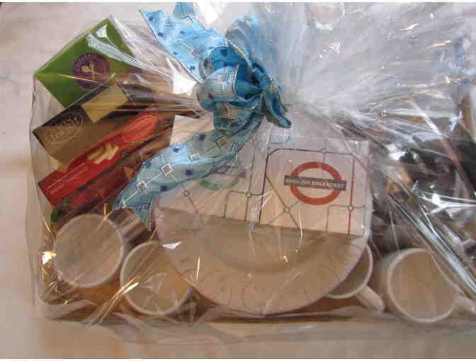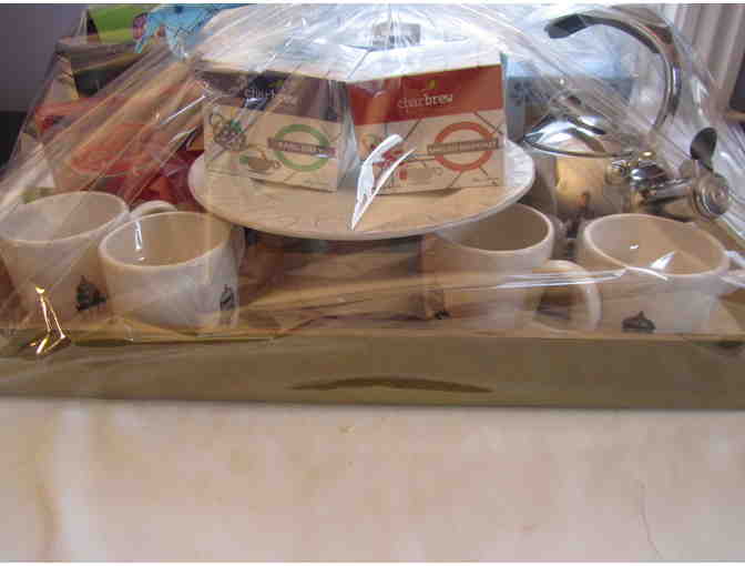 It's Tea Time with this great gift basket filled with fantastic teas & tea accesories. So reenact you favorite Downtown Abbey scenes with this basket that includes a teapot, 4 mugs, tea spoons, cake stand, assorted cookies,and teas.