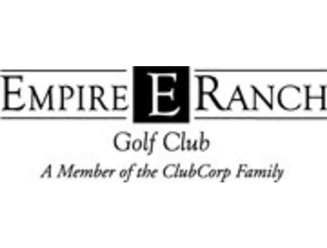 Empire Ranch Golf Club offers one round of 18 holes for two golfers with cart. Golf attire - collared shirts and soft spikes. Play Monday through Thursday, exluding holidays, tournament, and league play. Certificate expires Feb 28, 2015.