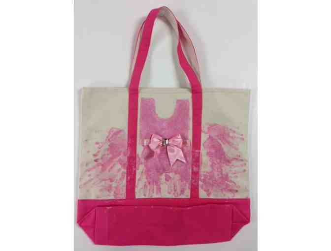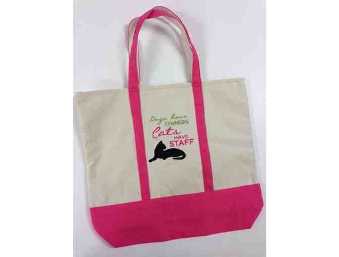 Pretty in pink! Hand decorated canvas bag from Daphne Papp. Opposite side of bag is for cat lovers: "Dogs have owners, Cats have Staff."
