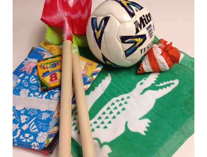 A mom of two filled this bag with toys and activities for kids to enjoy on the beach! Includes: Sand shovels, Soccer ball (donated by Pallazola's Sports in Gloucester), puzzle books, fish tote bag, and more surprises!