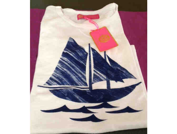 Women's cotton tee by Macbeth Collection. Size: Medium Navy on white.