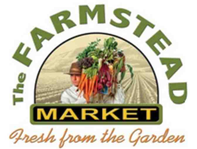 The gift basket contains a variety of sauces and snacks and a Farmstead Market gift certificate for $50 off grocery purchase.