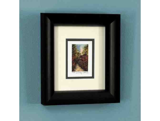With bright colors and delicate details, Kathleen Morolda uses the landscape and flora of New Jersey to inspire her pieces. "Tucked Away" is a limited edition lithograph on paper, numbered and hand signed by the artist. This piece was custom framed using acid free and archival materials and is ready to hang. Measures approx. 9.5" x 11" (with frame), 2" x 3.5" (image).