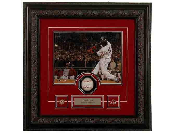 This shadowbox includes a David Ortiz hand signed official MLB baseball protected and preserved in a professionally designed museum quality shadow box. Item measures 28x5x38 and includes a certificate of authenticity by Executive Sports Memorabilia.