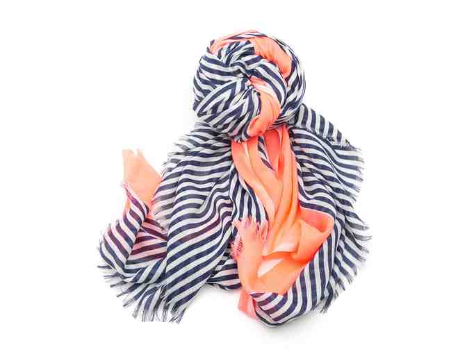 Womens navy blue and white striped scarf with bright pink border.