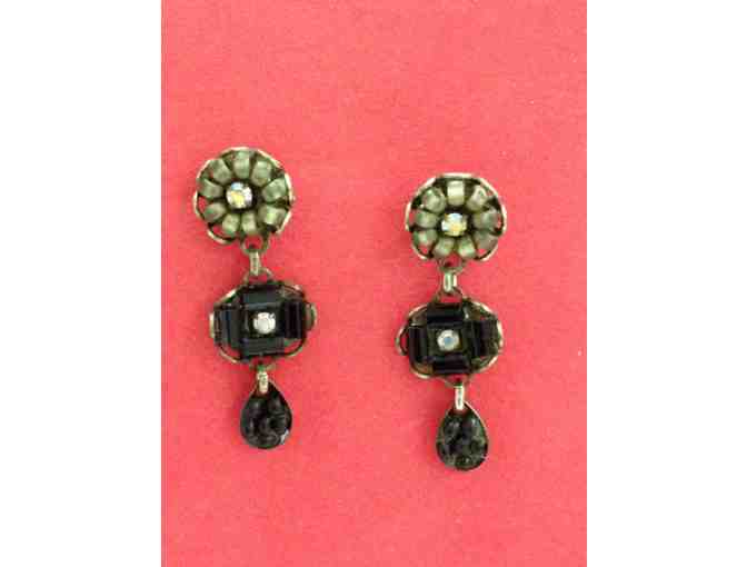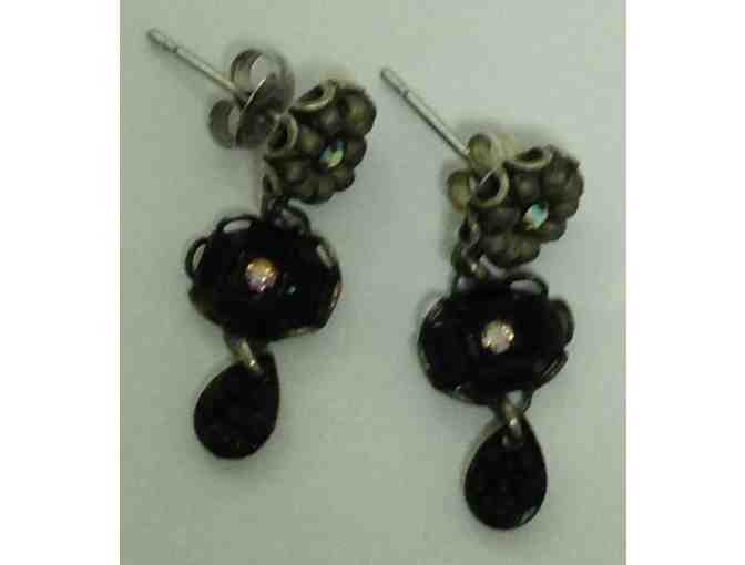 Black bugle bead, bronze beads and rhinestones. For pierced ears, one inch long.