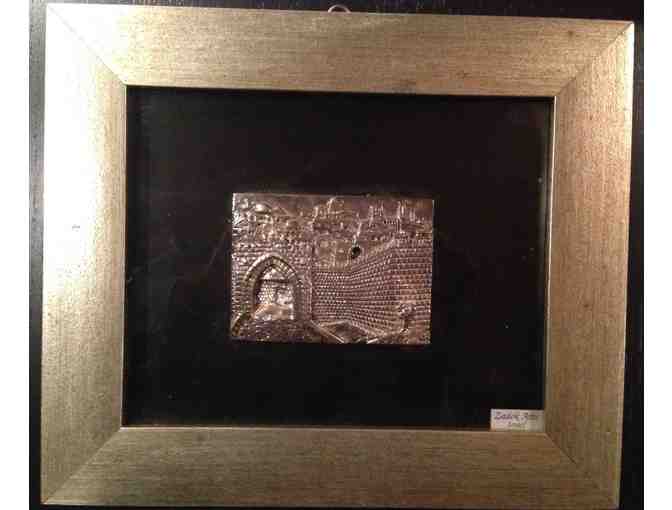 Sterling silver 925-clad relief of Jerusalem stones and walls, made by Zadok Arts, Israel. 100 mm x 70 mm. Framed on matte black background.