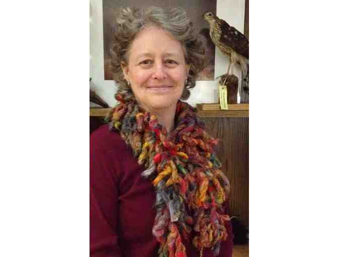 Handmade knit scarf in multiple jewel tones is new and 70" long. The scarf comes from the Artisan's Workshop in New London, New Hampshire.