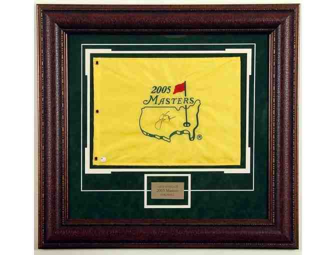 This authentic Masters flag is hand signed by Jack Nicklaus and is beautifully hand framed with a detailed nameplate. Considered one of the more most valued items of golf memorabilia. A certificate of authenticity by Executive Sports Memorabilia is included.
