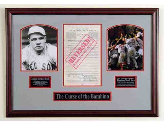 Reverse the Curse! DONE. This collage is a classic item for any Red Sox fan. Included in the awesome collage is a photo of Babe Ruth in a Red Sox uniform, a replica agreement of the famous transfer, and a 2004 World Champion Red Sox celebration photograph. This piece measures 18x36.