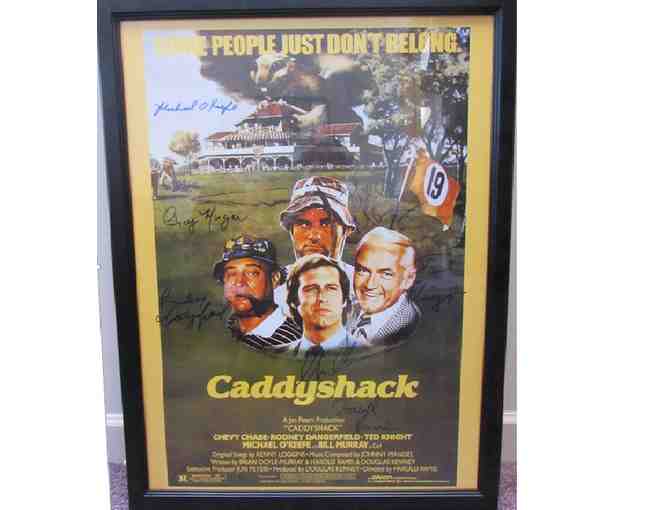 Framed Caddyshack poster. Signed by cast including Chevy Chase, Bill Murray, Rodney Dangerfield, Michael O'Keefe, Ted Knight, Cindy Morgan, and Director Harold Ramis.