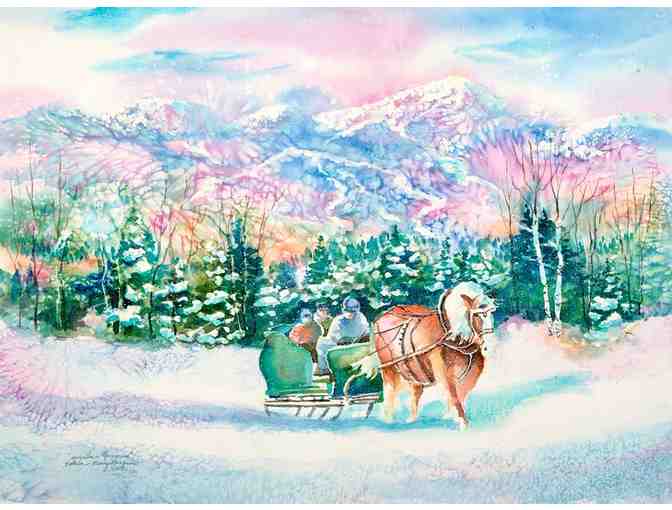 Most recently, she completed a collection of 42 original paintings of Stowe as it looked at the turn of the century for the Green Mountain Inn in Stowe, VT. Kathleen was the Featured Artist in the 2003-04 “Stowe Guide and Magazine” as well as the Cover Artist in the 2004-05 winter issue of the same magazine. She was also chosen as the Featured Artist in “Vermont Magazines- Arts and Culture Annual” in 2005. Her work has been chosen for the Brooks Calendar as well as the Fletcher Allen Calendar “A Celebration of Excellence.” Kathleen’s painting “Venice Canal” received the prestigious Mary Bryan award for excellence in 2007. In 2008 , Kathleen’s card, “The Sleigh” was chosen by Vermont’s Governor Jim Douglas as his Christmas Greeting and in 2009 he also chose her card “Camel‘s Hump”for his Greeting card. Most recently Kathleen was chosen as one of 38 Vermont Artists for the “ Champlain’s Lake Rediscovered “ Touring Exhibition that opened at Shelburne Coach Barn in Shelburne Vermont and traveled to the National Art’s Club in New York City, then on to Boston and then back to Vermont finishing up at the State House in Montpelier.This past summer , Kathleen was chosen as the 2010 Featured Artist at the Champlain Valley Fair. In March of 2012 she signed a licensing contract with the largest manufacturer on Maple Equipment in the nation to have her work featured on Maple Syrup Bottles to be sold worldwide.