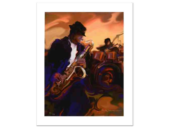 Using impressionist imagery, vivid colors, and flowing forms, Steve Bloom creates artwork unlike any other. "Jammin" is a limited edition mixed media on canvas, numbered and hand signed by Bloom. Includes Certificate of Authenticity! Measures approx. 14" x 18"