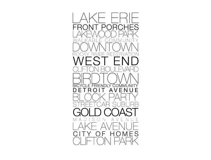 So many great neighborhoods, streets, and areas of Lakewood, Ohio in one subway print! Made especially for the Holiday Bid & Buy online auction by Lakewood resident Kristen Tellaisha.