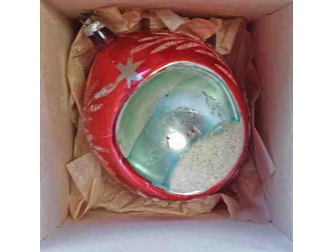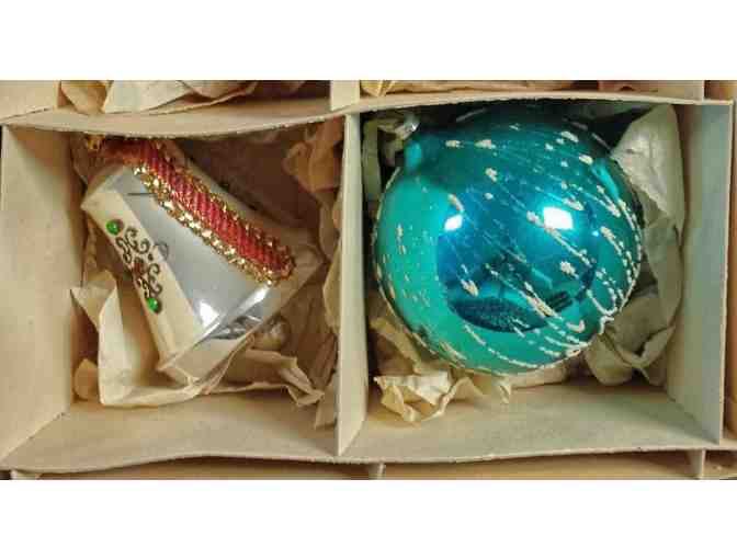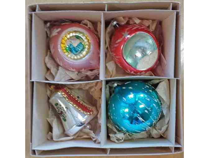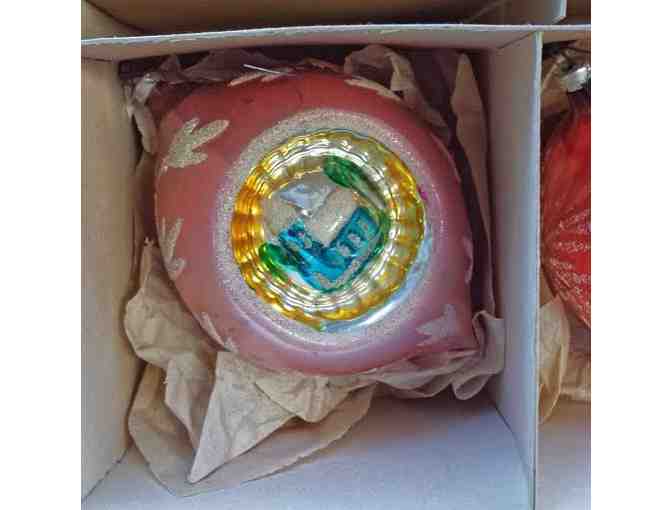 Box of 4 large 4-5 inch vintage multi-color glass Christmas tree ornaments. 4 beautiful styles in original box. Excellent condition.