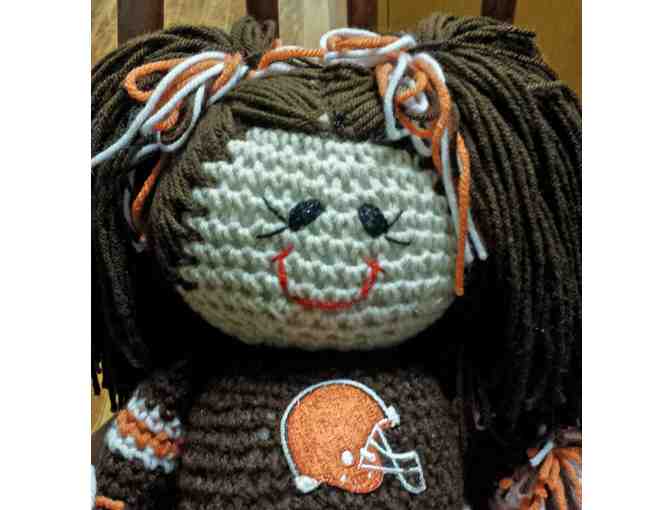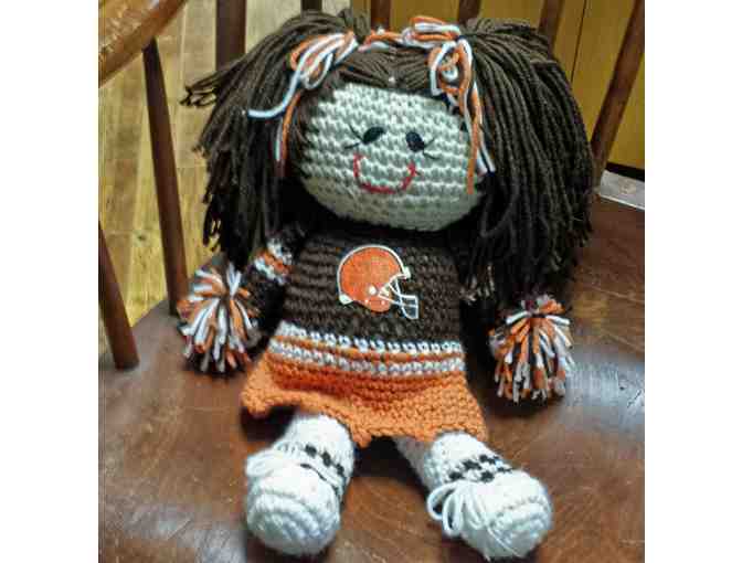 This little hand crafted cutie is adorable in her skirt and pig tails. Crocheted Cleveland Browns cheerleader mascot doll with an official orange patch on the front. Measures 16 inches long. Perfect for football fans of all ages.