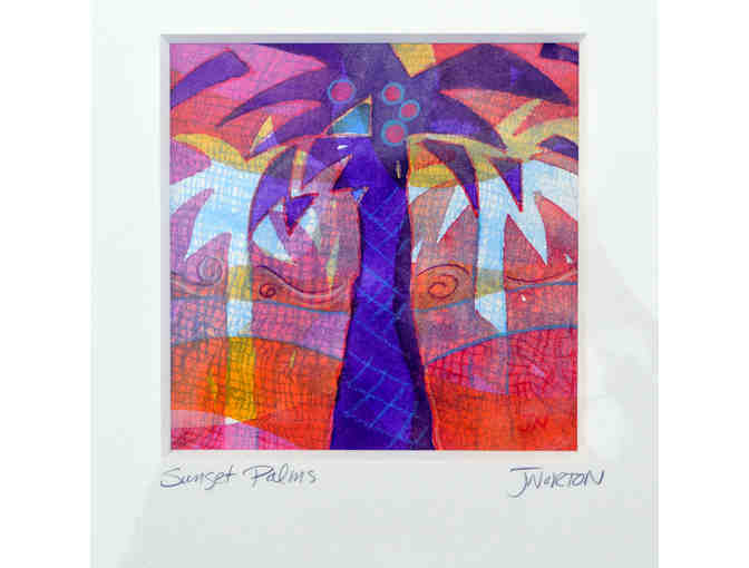 Colorful watercolor painting in pinks, oranges and purples of semi-abstract palm tree forms. Image size is 6x6 and matted in a bottom-weighted 11x14 8-ply white matting. Matting is titled & signed by artist.
