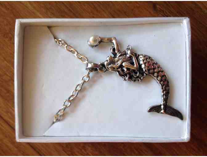 Silver-toned mermaid pendant with chain. Mermaid is holding a faux pearl. Largest pendant dimension is two inches. From World End Imports. Packaging says not intended for children under 12.