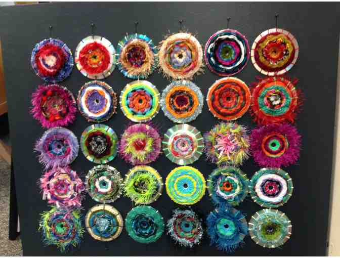 Mrs Fugura classroom art Parent Joan Thompson used upcycled CD's and had each child hand weave with various Yarns to creat this art piece. ready to be displayed in your home