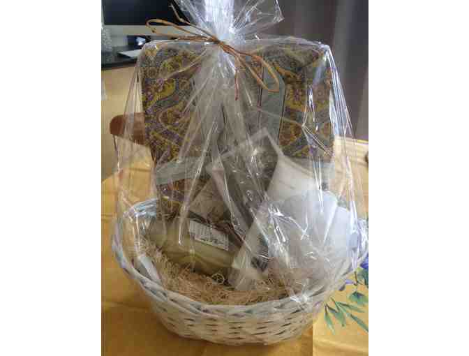 At home spa day! Basket includes a yellow paisley bathrobe, inflatable bath pillow, bath scrub puff, Green Tea relaxing bubble bath, and Green Tea body lotion.