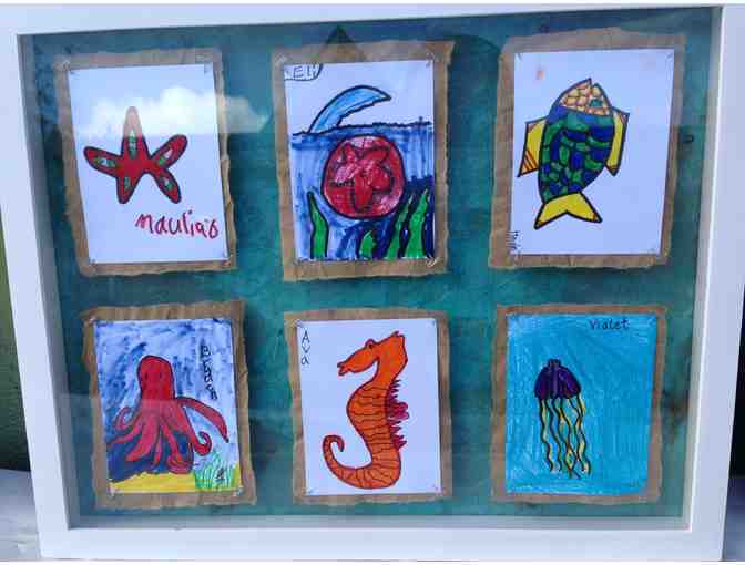 Each child created a one of a kind sea creature using color markers. There are fish, seahorses , jellyfish and many more . They are signed by the children , framed in groups of six.These would look great grouped together on your walls.