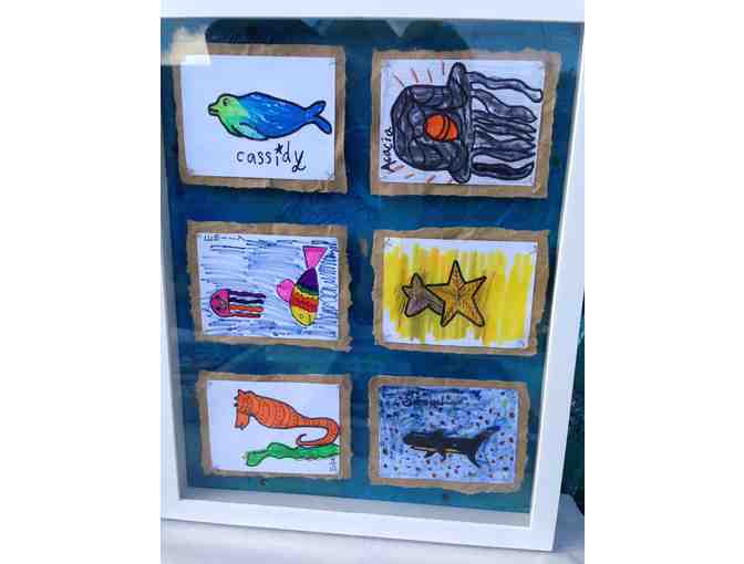 Each child created a one of a kind sea creature using color markers. There are fish, seahorses , jellyfish and many more . They are signed by the children , framed in groups of six.These would look great grouped together on your walls.