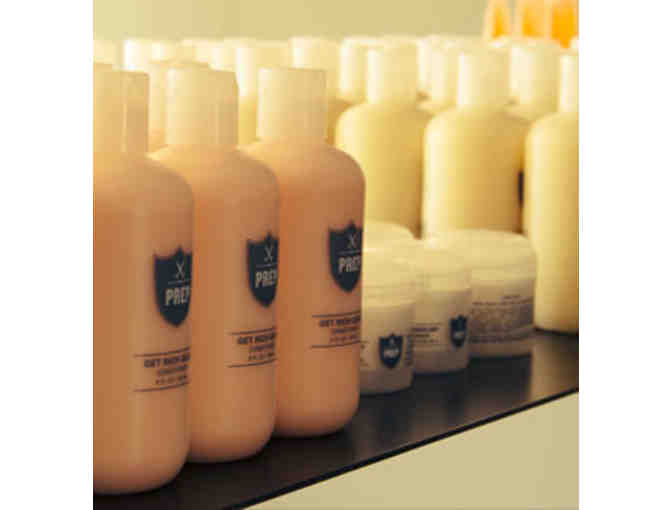 This PREP Package includes a $25 Gift Card and their special "Get Rich Quick" shampoo and conditioner -- their safest product for stressed out hair that uses French Argan Oil to keep hair thick and shiny!