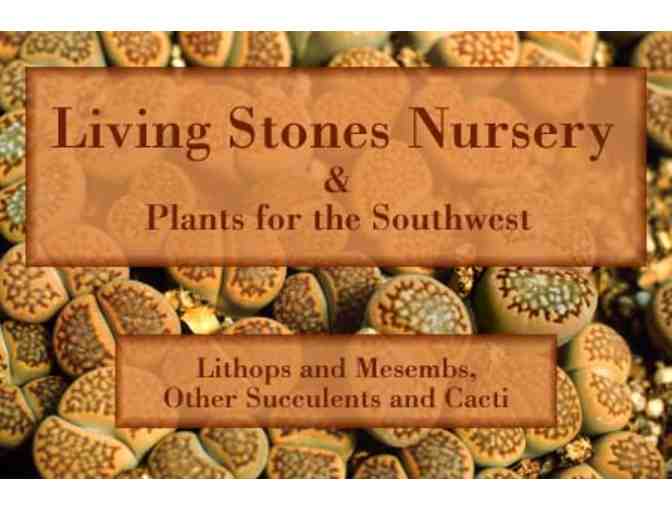 Plants for the Southwest and Living Stones Nursery are one and the same. By 1985, my plant collection had outgrown my home and so I left my job as plant propagator at the Arizona Sonora Desert Museum to take care of this growing number of plants under the guise of running a plant business. (Luckily it worked!) Fortunately, my then not yet wife, Jane Evans owned a piece of property where she had her flower shop and I could build my nursery, Plants for the Southwest. In 1987, we acquired the Storms¿ lithops collection and were immediately thrust into the mail order world, where we took the name Living Stones Nursery for our catalog business. In 1990, Jane closed the flower shop to work full time in the nursery. We currently have two greeters, Aurea and Wasson (dogs).