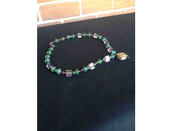 Hand Made Green and Purple Beaded Necklace with Metal Pendant. 16"