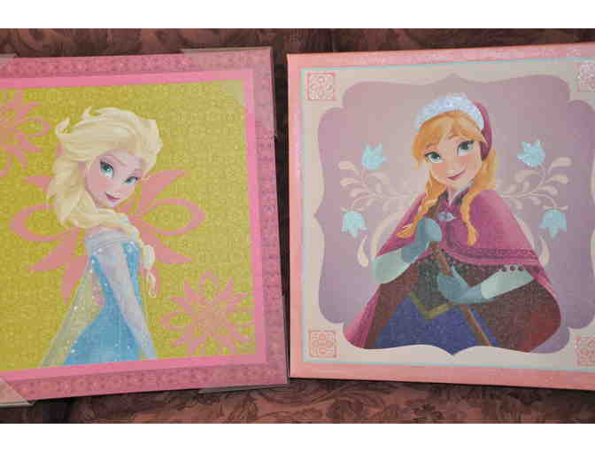 Perfect for the Disney movie: "Frozen" fan in your family. This listing includes 2 "Frozen" Themed Canvas prints of Elsa and Anna, and also includes an Ice Skating Elsa doll from Mattel.