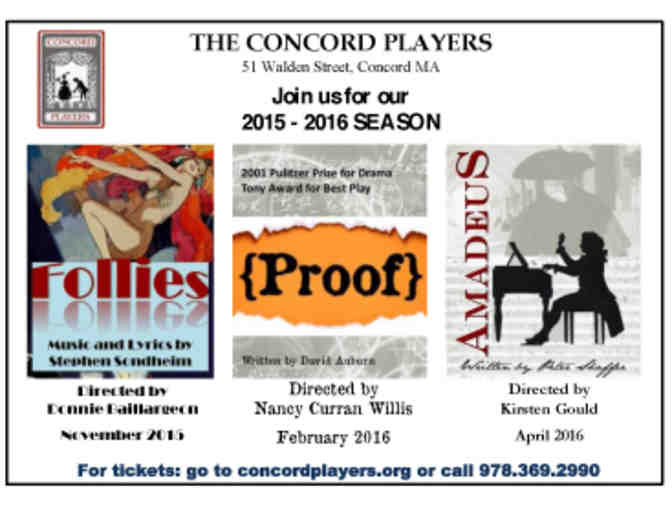 Two (2) tickets to the show of your choice in the Concord Players' 2015-16 season: Follies, Proof, or Amadeus.