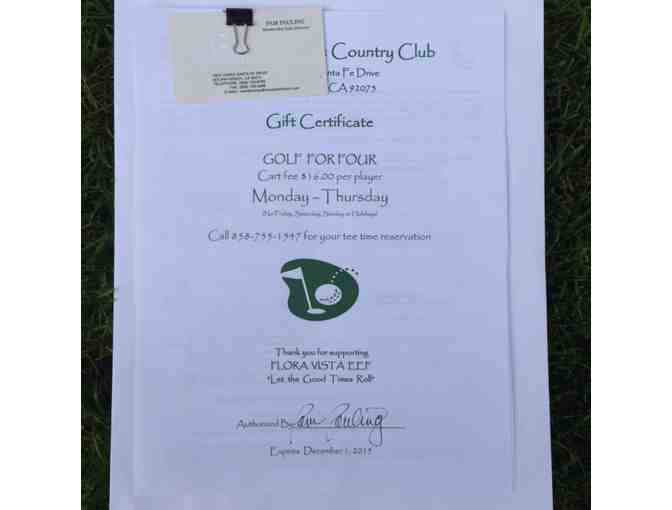 Golf For Four at Lomas Santa Fe Country Club. 1505 Lomas Santa Fe Drive, Solana Beach, CA 92075. Call 858-755-1547 for your tee time reservation! Thank you for supporting FLORA VISTA EEF.