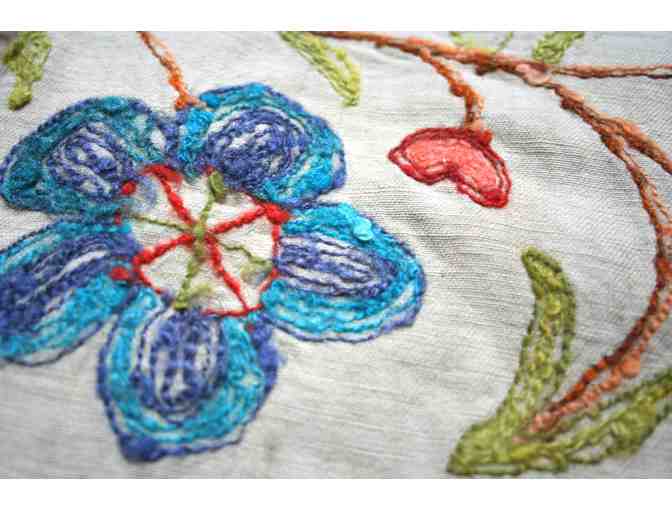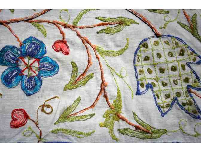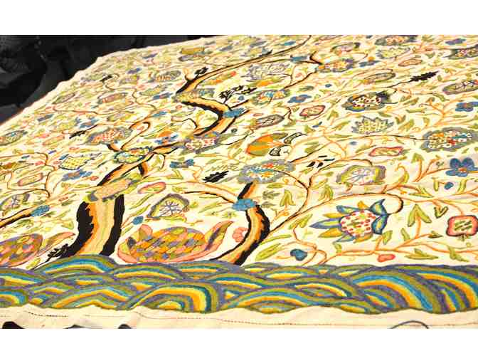 Crewel is an ancient embroidery art using wool – a stitchery technique at least 1000 years old. It enjoyed a heyday in the 17th century and continued throughout early America. This piece was passed on through several pilgrim ancestors who carried it from place to place, possibly by covered wagon and/or steamboat, landing finally into my grandmother's cabin in Leland where it was most probably used as an "over-bed" hanging to create warmth and hold the warp of pioneer days past.
