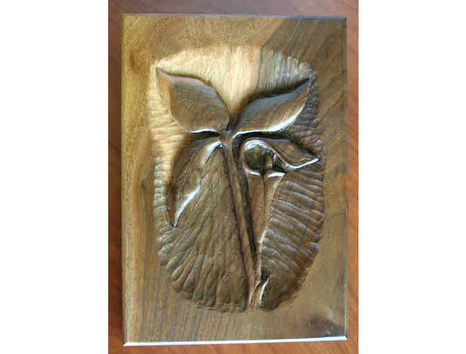 A pair of beautifully carved wildflower designs on black walnut. These carvings of a Jack-in-the-Pulpit and a trillium will bring back memories of a Leelanau spring, even in the depths of winter.
