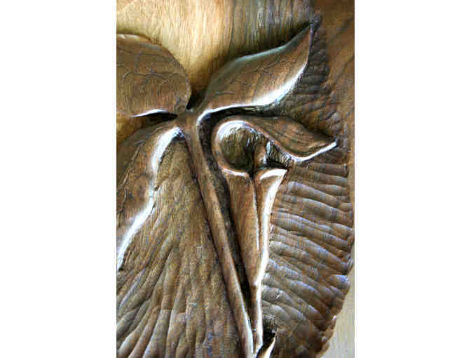 One of a trillium and one of a Jack-in-the-Pulpit. Approximately 7.5" by 11". Carved black walnut with hooks on the back for easy hanging.