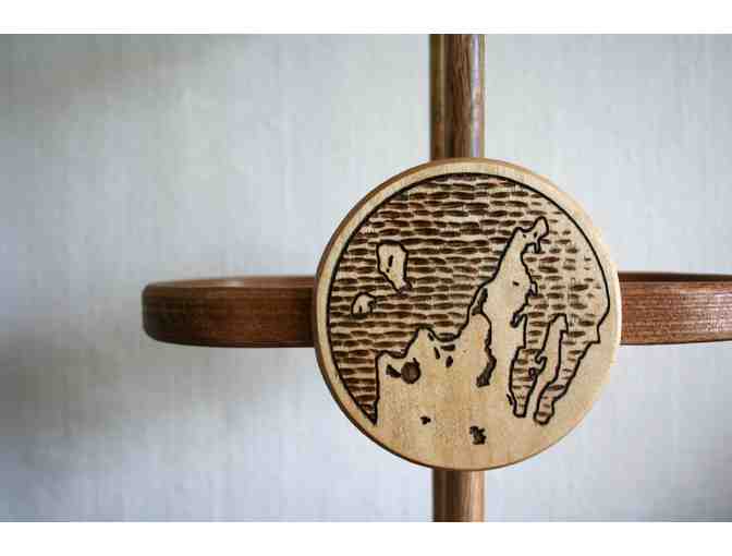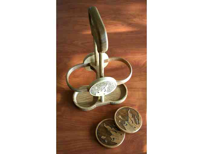 Leelanau wine bottle holder and two Leelanau Coasters. Wine holder is quarter-sawn white oak with red elm and maple. Coasters are cherry.