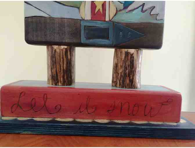 It features a winter night scene complete with a starry sky, cabin, snowman, and pine trees. Has the words "let it snow" written on the back and front of the base.
