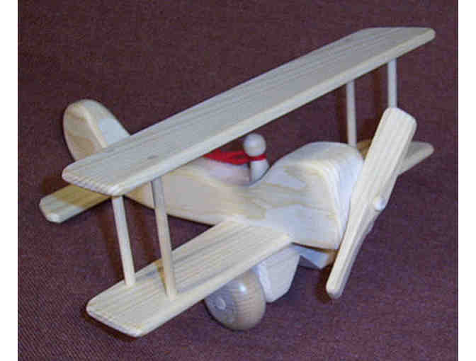 Handcrafted wooden toy Red Baron Bi-plane is a favorite toy of kids and adults alike. The wingspan and the body both measure 12” long, and it comes with a removable red scarfed pilot and a propeller that spins. The wood toy Red Baron bi-plane is hand sanded to a satin smooth natural finish.