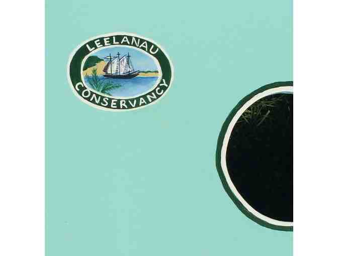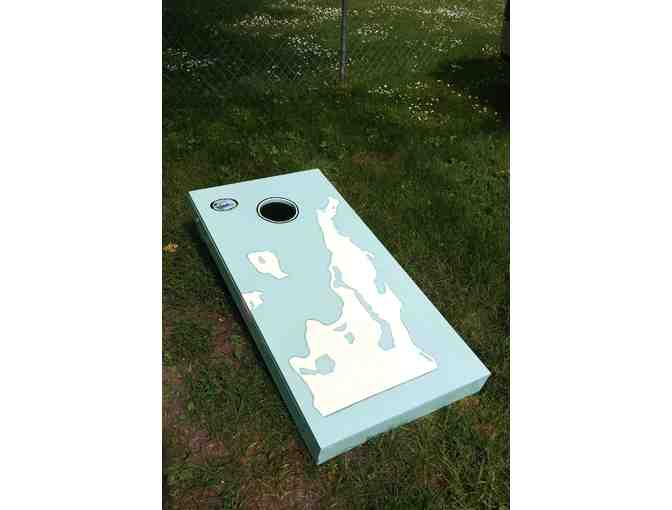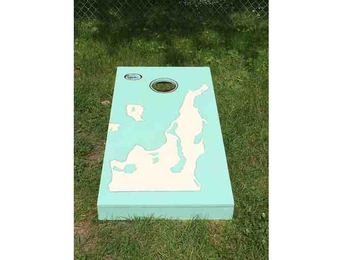 Hand-painted corn hole game with map of Leelanau county in robin's egg blue and off-white as well as a hand-painted Leelanau Conservancy logo!