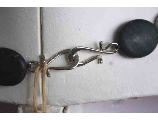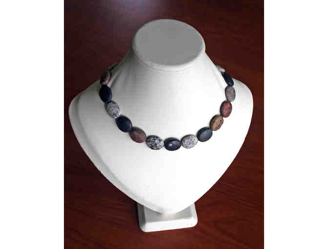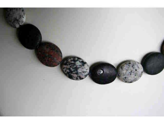 Stunning Lake Michigan Beach Stone Necklace by Becky Thatcher Designs. This Beautiful necklace features beads made from stones pulled right off a Lake Michigan Beach. One bead has a bevel-set 10 point ct diamond.