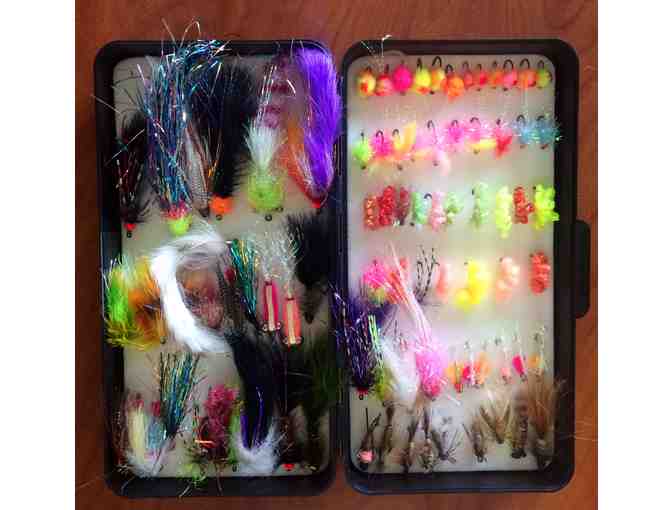 An assortment of 82 hand-tied Steelhead trout flies in a foam lined fly box. A complete range of flies from egg patters to swinging flies to chuck and ducks!