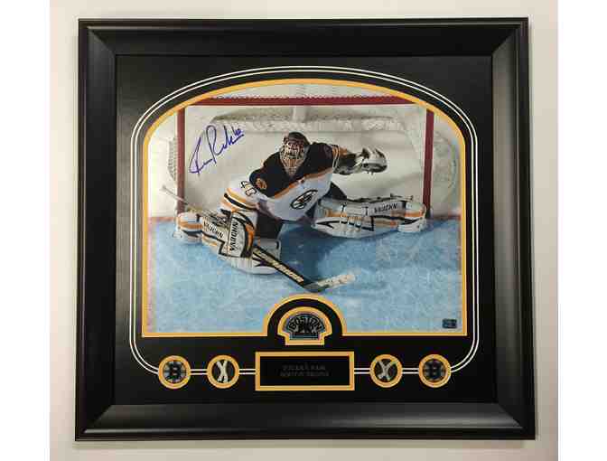 A framed, autographed 16x20 action shot of Bruins goalie Tuukka Rask