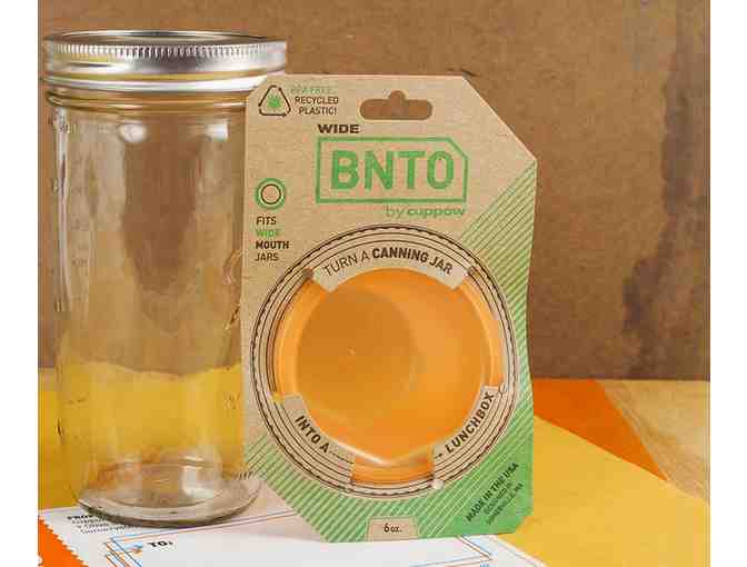 One orange 6-ounce BNTO lunchbox adapter for use with a wide mouth canning jar. Jar included.