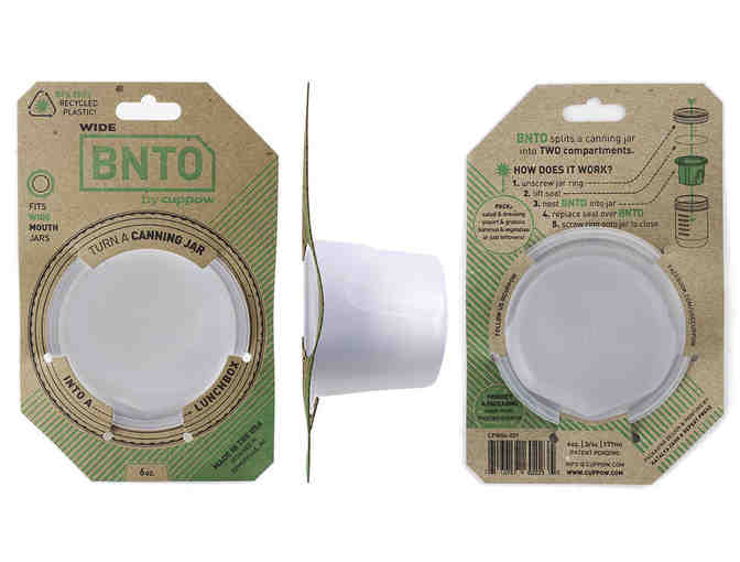 One white 6-ounce BNTO lunchbox adapter for use with a wide mouth canning jar. Turn a canning jar into a lunchbox! Jar not included.