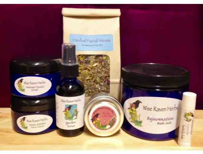 A natural full-body spa package! Products are handmade with organic ingredients by Herbalist Jen Goff of Wise Raven Herbs! Includes: Harvest Facial Cleanser (8+ treatments), Green Goddess Facial Mask (8+ treatments), Herbal Facial Steam (4+ treatments), Garden Toner (2 fl.oz.), Rejuvenation Bath Salts (enough for 4 baths), Rose Lotion Bar, and Lavender Lip Balm. Treat yourself or your loved ones to these truly natural face and body treatments.